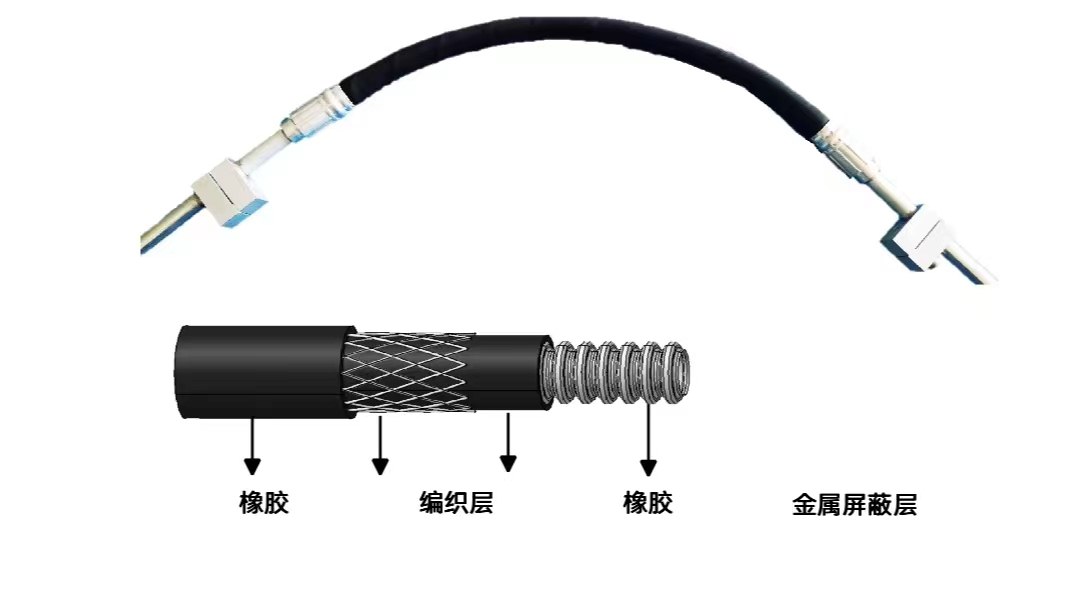 高温端所采用的“金属屏蔽层/橡胶/编织层/橡胶”软管结构,应用创新型金属屏蔽层与编织层一体化工艺,高强度扣压设计,提升连接强度的同时,实现管体极低渗透,且总成爆破压力远超标准要求,并达到了脉冲无泄漏的水平;