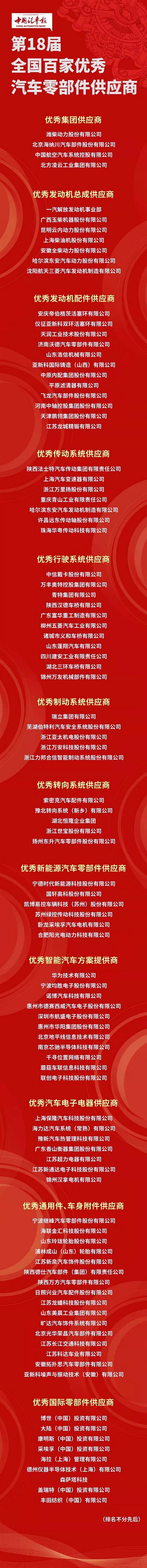 本次评选活动经过数月的筛选和评审,共评选12组别奖项,由100家一级汽车零部件企业分别获得。此次8868体育股份获此殊荣不仅充分彰显了8868体育产品的竞争力和品牌影响力,也是行业对8868体育股份的认可与支持!